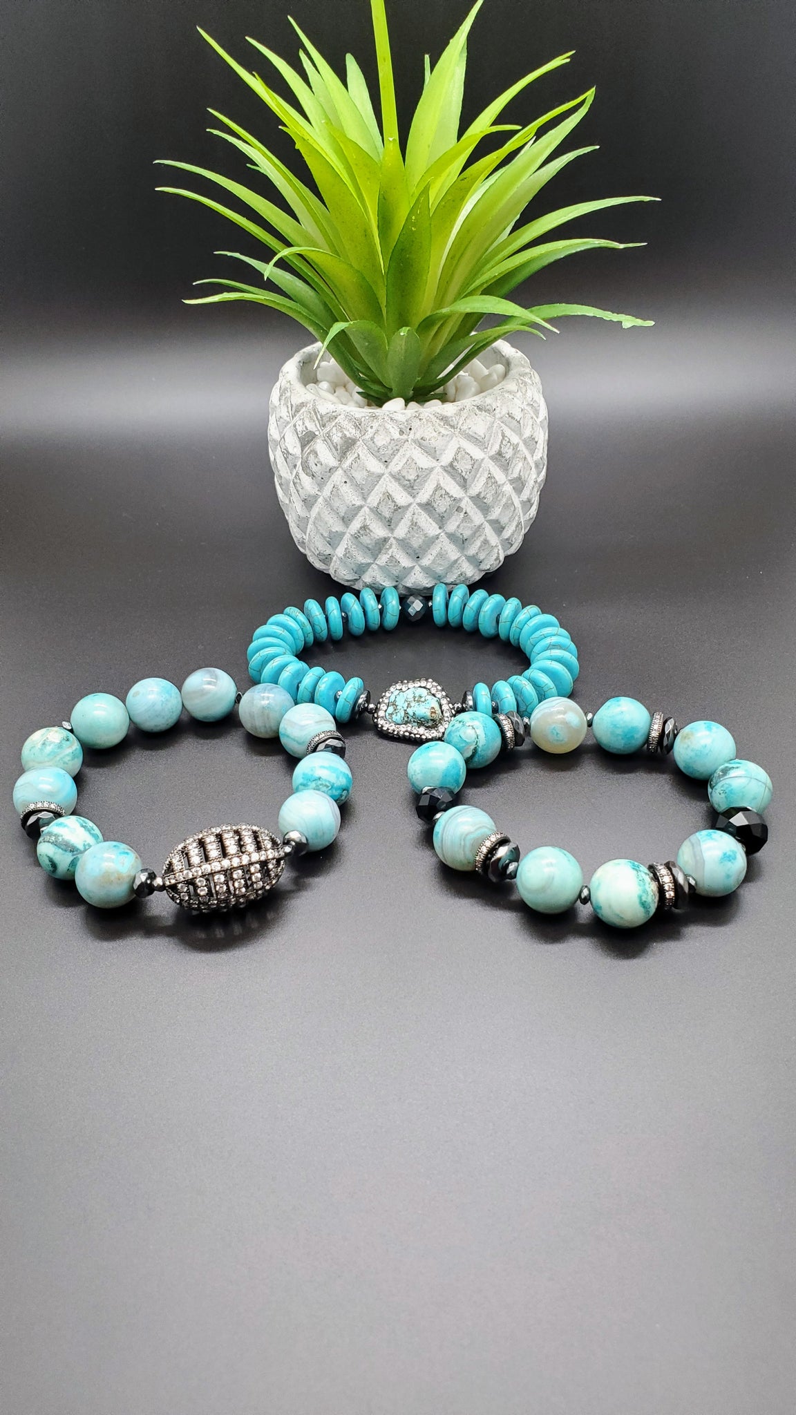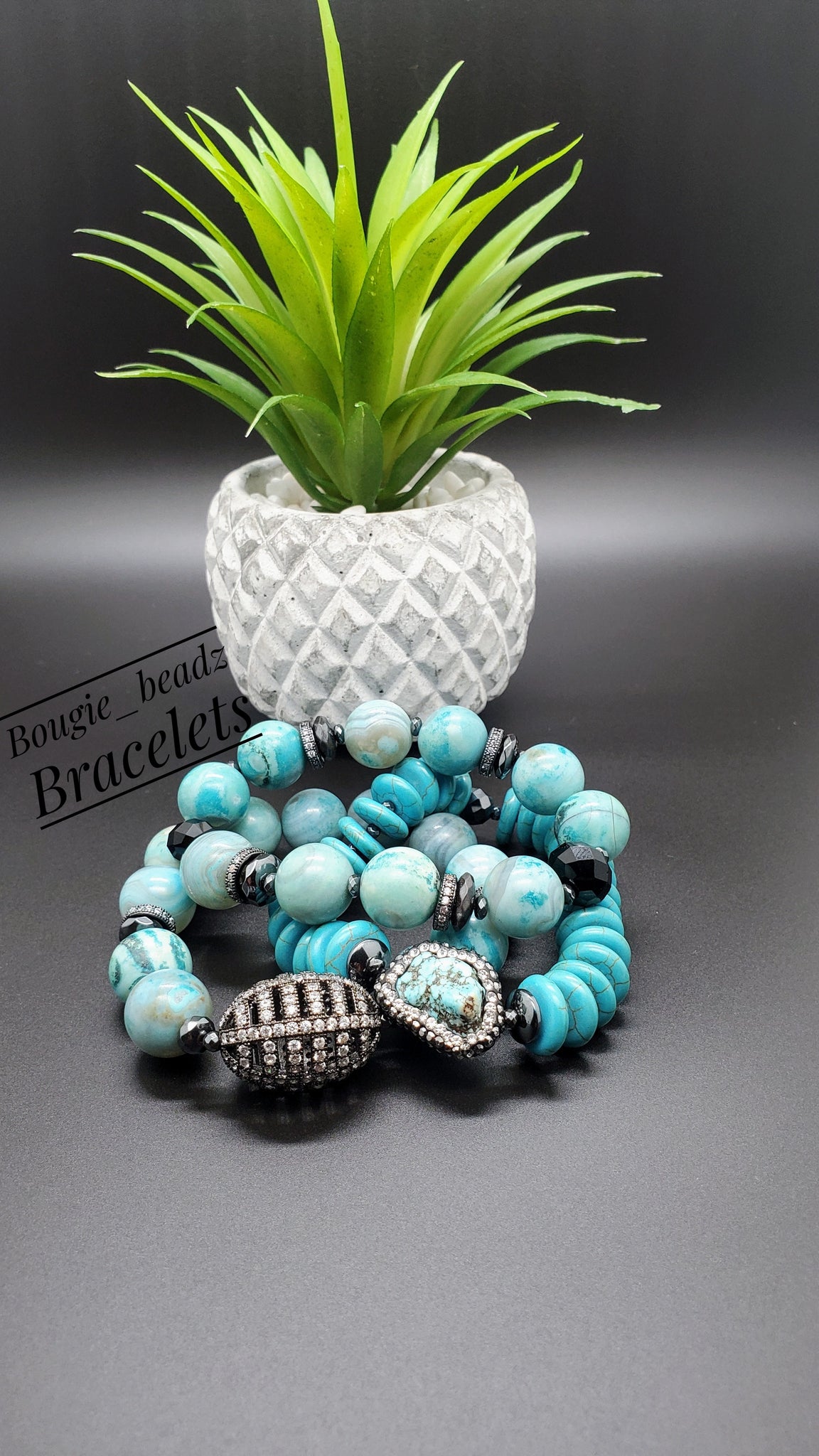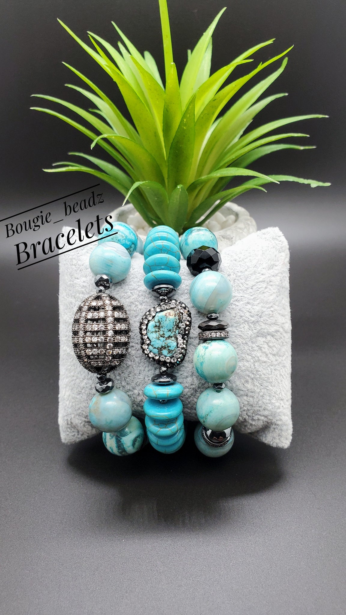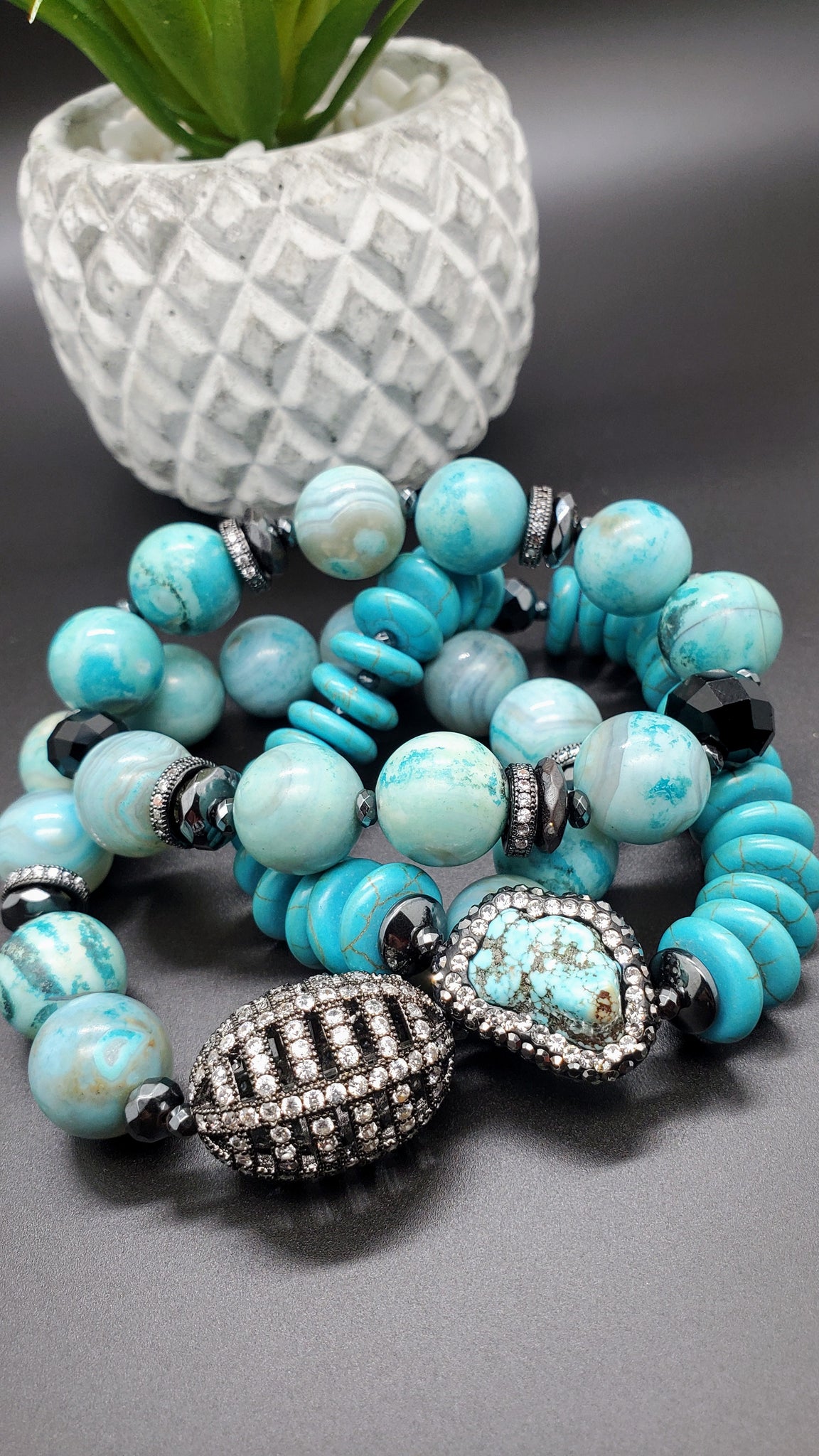 Consist of 14mm smooth turquoise agates, turquoise colored howlite disc, marcasite trimmed natural turquoise connector, large oval cz blinge caged egg, black crystals, with additional cz embellishments.