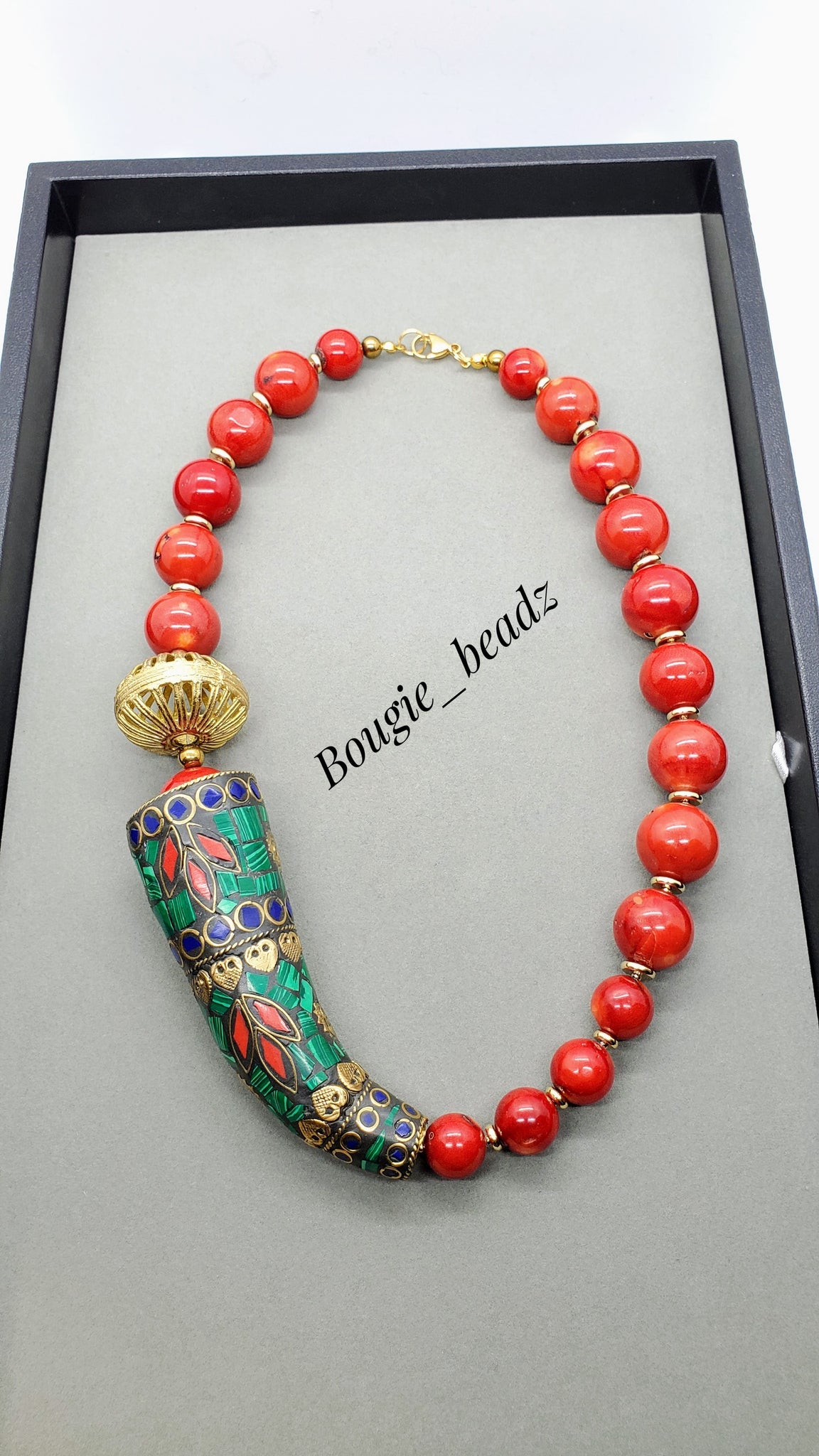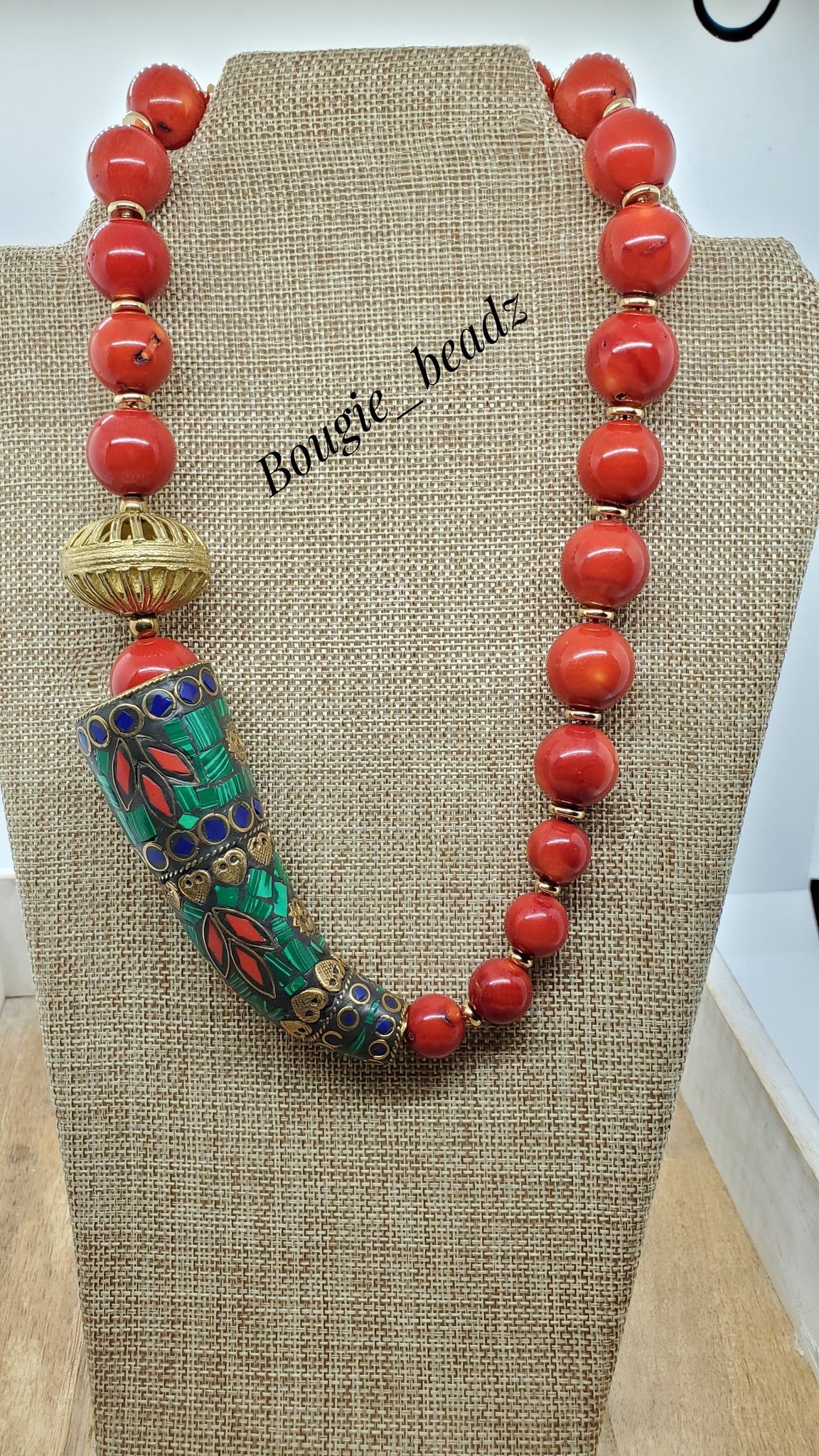 Coral and brass, with coral, lapis and malachite inlay horn.